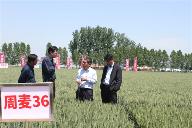 會議期間,參會代表觀摩了周園種業試驗基地。周口市農科院副院長韓玉林研究員現場為大家介紹了周麥36號新系在原有基礎上抗倒抗逆更強特征的具體表現。通過實地觀摩,參會代表對周麥36號的優良特性有了更直觀的認識,進一步增強了推廣種植的信心。