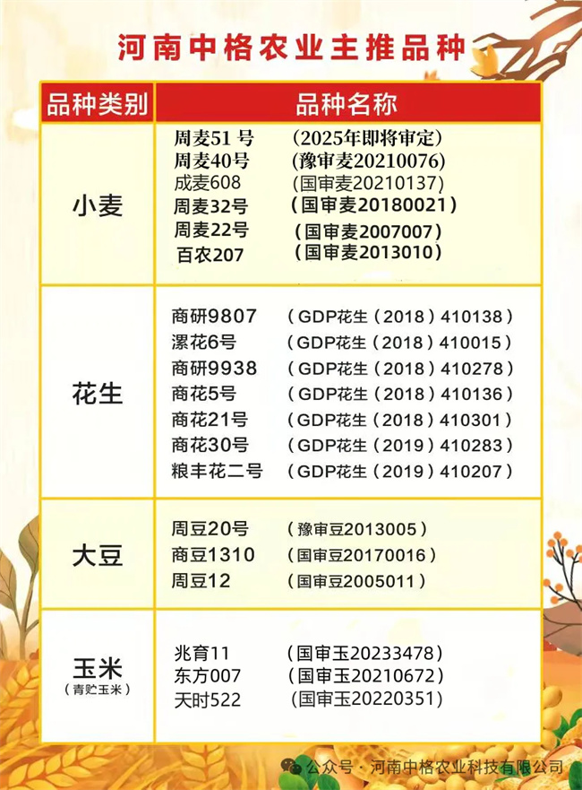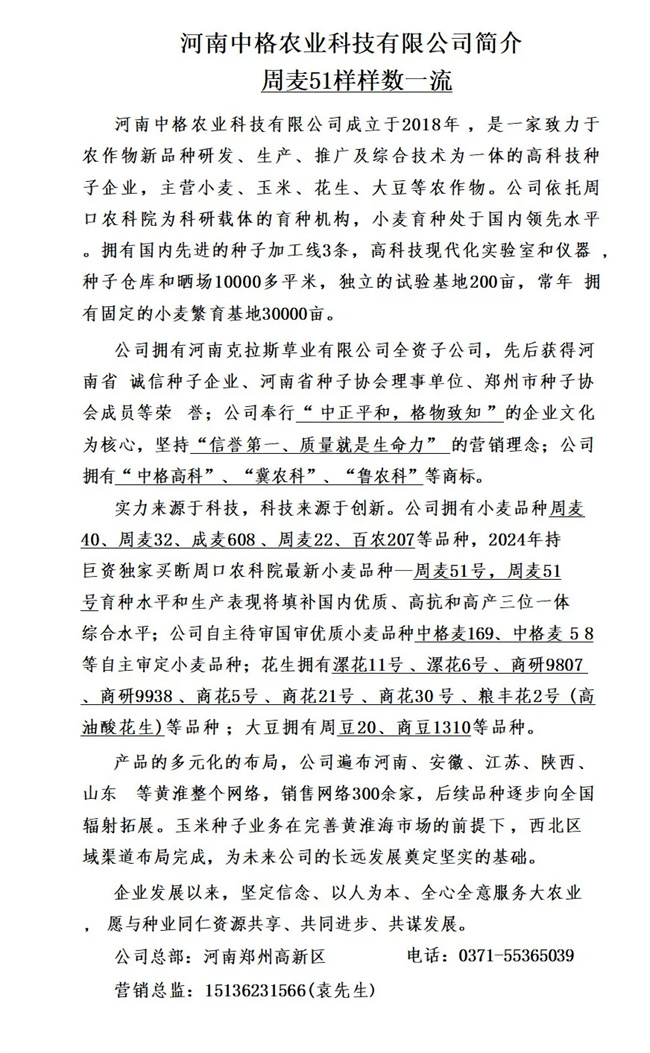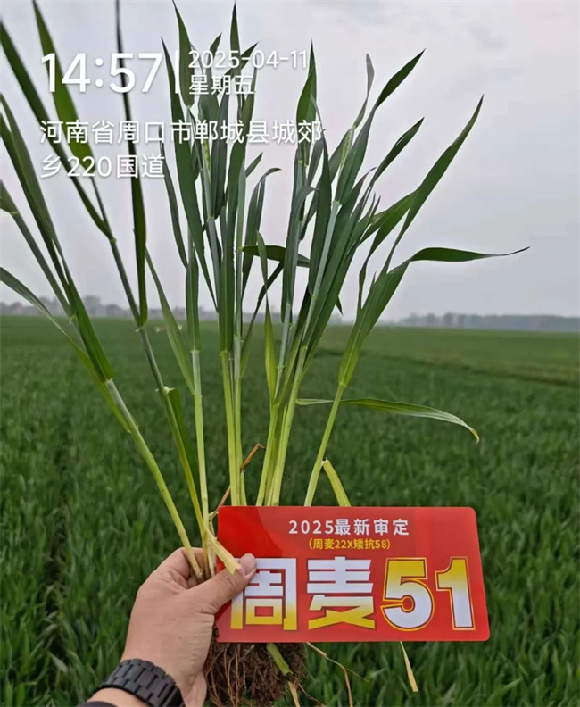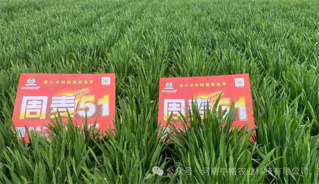 “周麥51”由周口市農業科學院通過常規定量育種+雙單倍體育種( DH )+分子標記輔助育種( MAS )+抗病性接種和抗逆性鑒定+就地一年4次加代技術+品質平行測定篩選等技術選育而成,該品種特點為矮稈大穗、高抗病、抗倒性特強、高產穩產優質,綜合育種技術處于國內領先水平。由河南中格農業科技有限公司獨家經營。