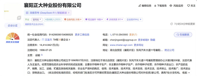 公開信息顯示,正大種業成立于1996年7月,距今已經有近30年的經營歷史,注冊資本1.44億元,注冊地址為湖北自貿區襄陽片區,主營業務為玉米種子研發、生產、銷售,是國家育繁推一體化種業企業。