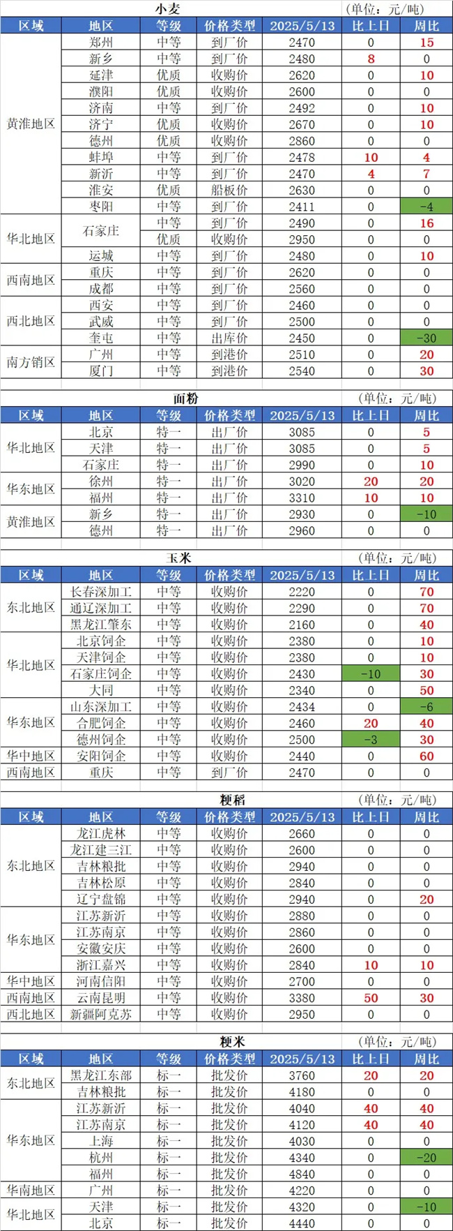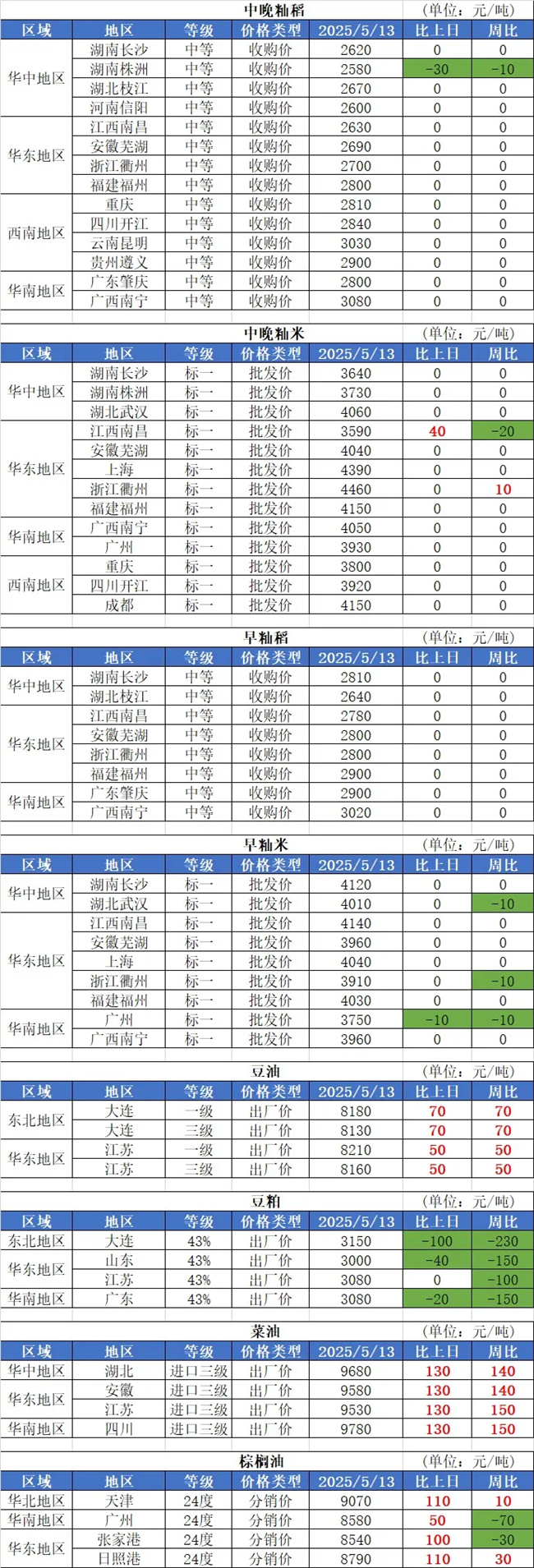 3、5月13日,最低收購價稻谷拍賣共投放約61.9萬噸,其中早秈稻投放約1.8萬噸,無成交;中晚秈稻投放約30.1萬噸,成交約0.5萬噸,成交均價2571元/噸;粳稻投放約30萬噸,成交約21.1萬噸,成交均價2675元/噸。