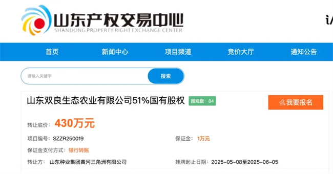 5月8日,山東種業集團黃河三角洲有限公司(簡稱“黃三角公司”)通過山東產權交易中心掛牌轉讓山東雙良生態農業有限公司(簡稱“雙良農業”)51%的國有股權,轉讓底價為430萬元。