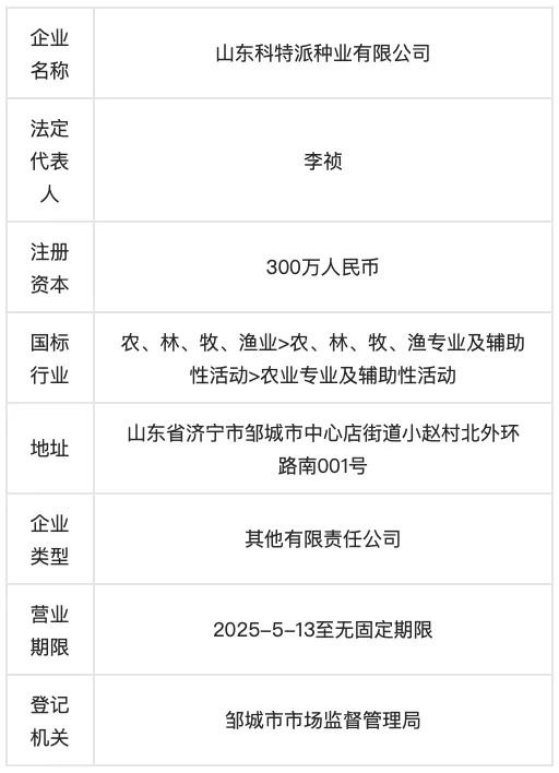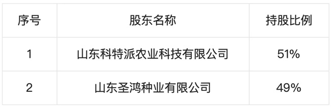 天眼查App顯示,近日,山東科特派種業有限公司成立,法定代表人為李禎,注冊資本300萬人民幣,山東科特派農業科技有限公司、山東圣鴻種業有限公司持股。