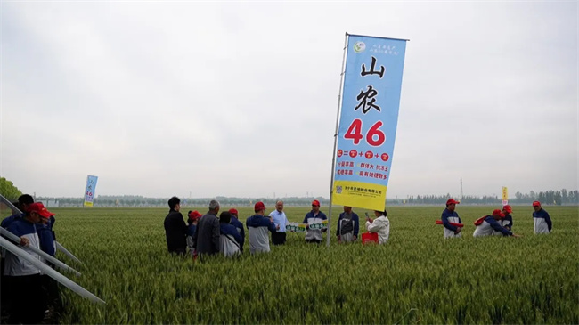 觀摩會上,山農46和濟儒麥24、菏麥127三大明星品種吸引了眾多關注。山農46由山東農業大學選育,具有高產穩產、廣適冬性等特點。其苗期抗寒性強,分蘗能力強,成穗率高,畝穗數超43.9萬,穗粒數達40粒,千粒重45—48克。在區試預試中,較對照增產顯著,生產試驗增產5.2%,居小組第二。此外,該品種莖稈韌性好,抗倒能力強,后期抗干熱風,落黃熟相佳,綜合表現突出,深受農戶喜愛。