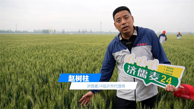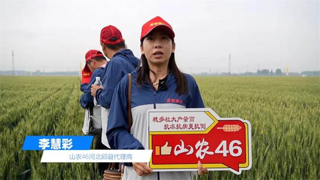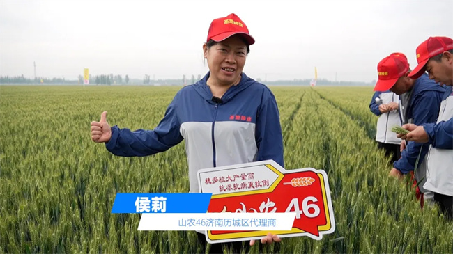 在觀摩田現場,來自邱縣、成武以及濟南歷城區的山農46經銷商分享了種植推廣經驗。他們一致認為,山農46在連續三年的種植推廣考察中表現卓越,抗寒抗凍性能突出,抗倒能力強,綜合抗病性表現尤為出色,深受廣大農戶喜愛。臨沂經銷商對濟儒麥24也給予了高度評價,認為該品種蠟質層厚,抗性好,尤其對當地常發的白粉病抗性優異。近兩年的種植表明,一般地塊畝產可達1300—1400斤,高水肥地塊畝產可達1500斤以上。經銷商們紛紛表示,對推廣這兩個品種充滿信心。