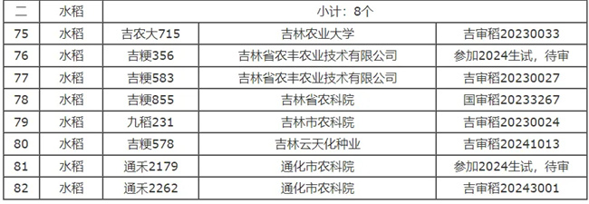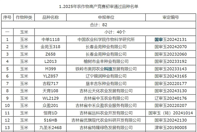 吉林省農業農村廳根據《關于開展2025年吉林省農作物高產品種競賽活動的通知》要求,經活動組委會綜合篩選及查詢標準樣品庫,共有82個農作物品種通過初審。其中,玉米品種40個,大豆品種34個,水稻品種8個。