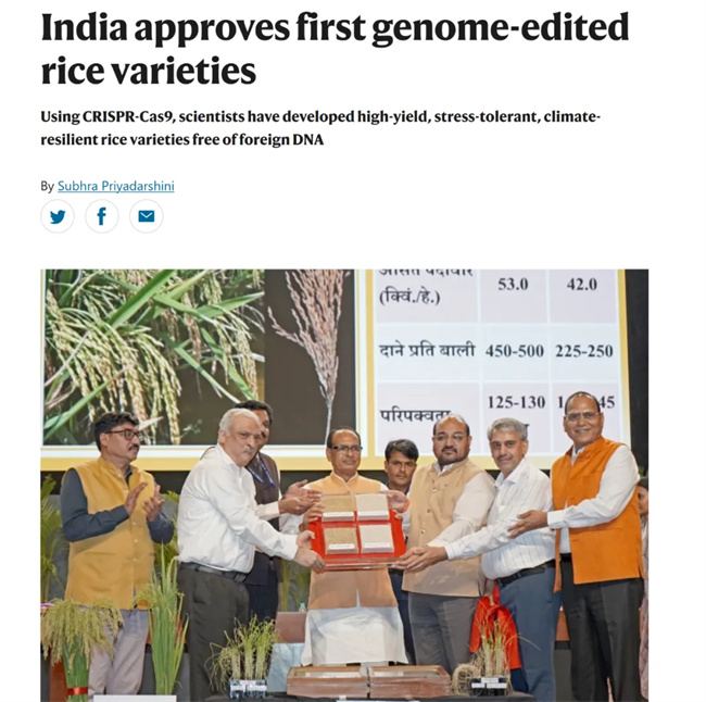 2025年5月4日,印度政府宣布批準兩個本土研發的基因編輯水稻品種Pusa rice DST1和DRR Dhan 100進入大規模種植試驗階段,后續推進商業化推廣。