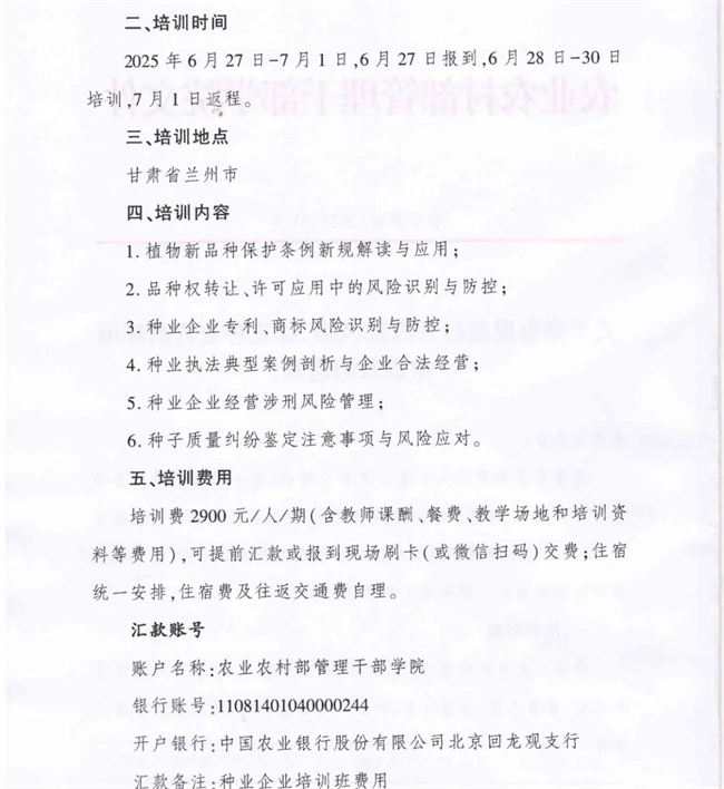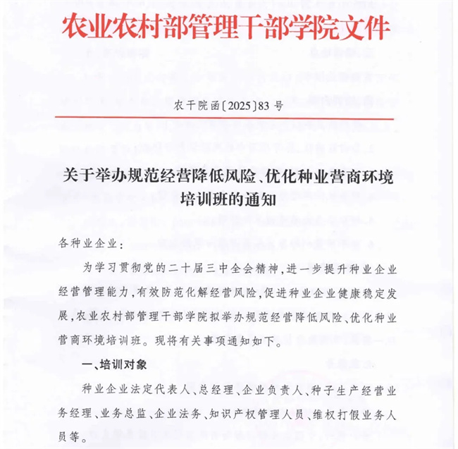 為(wei)學(xue)習貫徹黨的二(er)十屆三(san)中全會精神,進一步提升種(zhong)業企(qi)業經(jing)(jing)營(ying)(ying)管理能力(li),有效(xiao)防范化解經(jing)(jing)營(ying)(ying)風(feng)險(xian),促進種(zhong)業企(qi)業健康穩定發展(zhan),農(nong)業農(nong)村部管理干部學(xue)院擬舉(ju)辦(ban)規范經(jing)(jing)營(ying)(ying)降(jiang)低風(feng)險(xian)、優化種(zhong)業營(ying)(ying)商環境培訓班。現將有關事(shi)項通知如下。