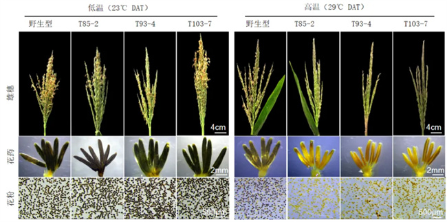 圖1.四分體時期日均氣溫(DAT)低溫與高溫時雄花育性表型