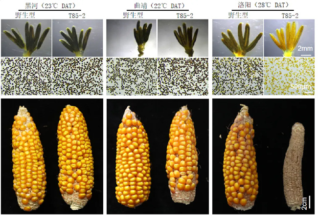 全國14個生態試驗點鑒定了揭示了突變體地理-溫度-雄花育性耦合規律:北方春玉米區(黑河、佳木斯)、黃淮海北部(北京、石家莊)及西南高海拔區(曲靖)等日均溫≤25℃區域,育性正常,適合繁親;黃淮海南部(洛陽、新鄉)、南方丘陵區(南京、武漢)及西北干旱區等日均溫≥28℃區域,突變體雄性不育,適宜于繁雜(圖2)。