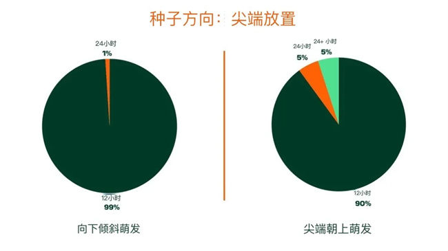 種子科學 :種子若以尖端朝上的方式放置,初發芽時胚莖會向下生長。胚莖被迫改變方向,需要消耗時間和能量,導致出苗延遲。