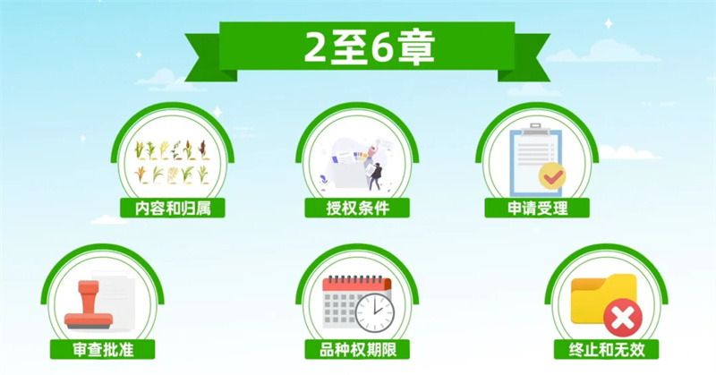 2至6章,包括品種(zhong)權內容和(he)歸(gui)屬、授權條(tiao)件、申(shen)請受理、審查(cha)批準、品種(zhong)權期限、終止和(he)無效(xiao)等;