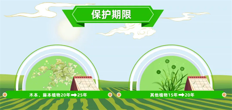 木本(ben)(ben)、藤本(ben)(ben)植物保護(hu)期限由20年延(yan)(yan)長到25年。其他植物保護(hu)期限由15年延(yan)(yan)長到20年。