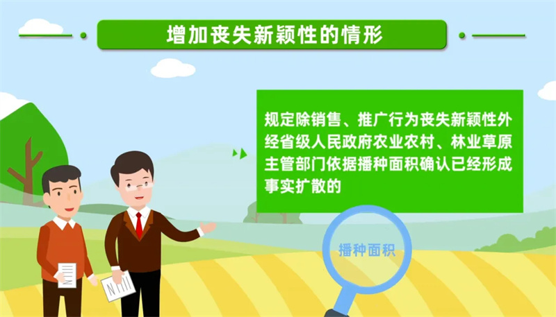 規定除銷售、推(tui)廣行為喪(sang)失新(xin)(xin)穎(ying)性外,經省級人(ren)民政府(fu)農業(ye)農村、林業(ye)草原(yuan)主管部(bu)門(men)依據播種(zhong)(zhong)(zhong)面積確認已(yi)經形成事實擴散的,以及農作物品種(zhong)(zhong)(zhong)已(yi)審定或(huo)者登記(ji)2年以上未(wei)申請植物新(xin)(xin)品種(zhong)(zhong)(zhong)權的,視為已(yi)喪(sang)失新(xin)(xin)穎(ying)性。