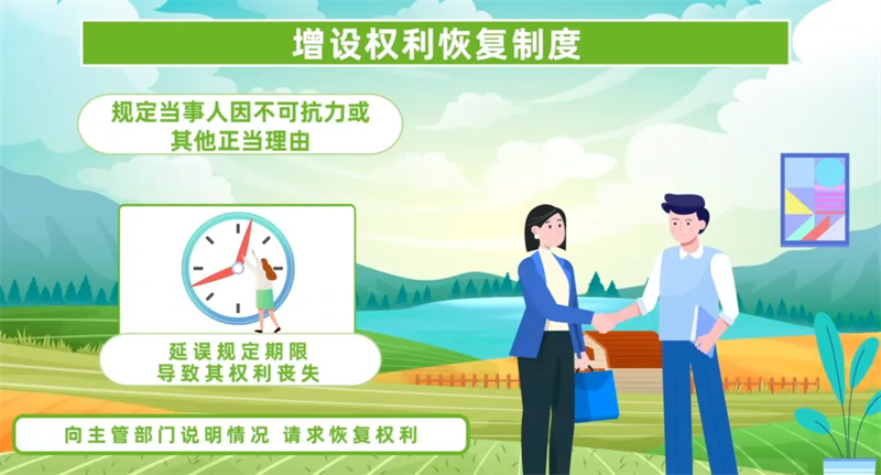 由6個月(yue)改為3個月(yue),情(qing)況復雜的(de)(de)可(ke)延(yan)長(chang)3個月(yue)。增設權利恢復制度(du)。規(gui)(gui)定(ding)當事人(ren)因不可(ke)抗(kang)力或其(qi)(qi)他正當理由而延(yan)誤規(gui)(gui)定(ding)期限(xian)、導致其(qi)(qi)權利喪(sang)失的(de)(de),可(ke)向主管部門說明理由,請求恢復權利。