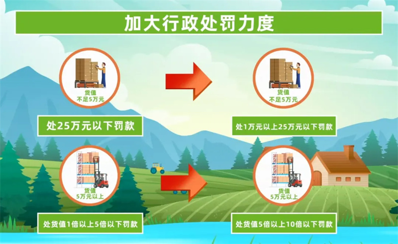 貨值(zhi)不足(zu)5萬(wan)(wan)(wan)(wan)元的(de),由處25萬(wan)(wan)(wan)(wan)元以(yi)下(xia)罰款(kuan)修(xiu)改為處1萬(wan)(wan)(wan)(wan)元以(yi)上(shang)25萬(wan)(wan)(wan)(wan)元以(yi)下(xia)罰款(kuan)。貨值(zhi)5萬(wan)(wan)(wan)(wan)元以(yi)上(shang)的(de),由處貨值(zhi)1倍(bei)以(yi)上(shang)5倍(bei)以(yi)下(xia)罰款(kuan)修(xiu)改為處貨值(zhi)5倍(bei)以(yi)上(shang)10倍(bei)以(yi)下(xia)罰款(kuan)。