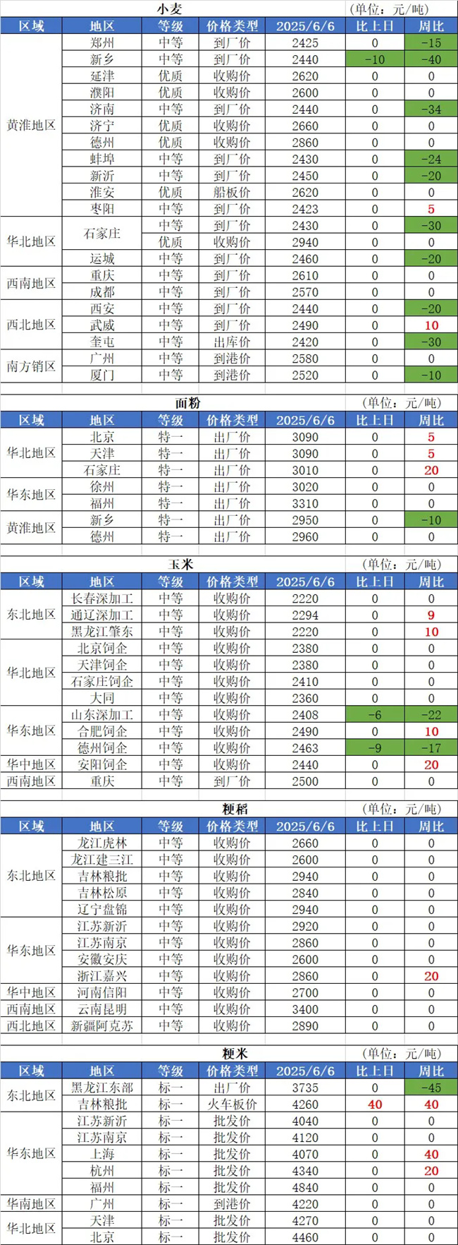 2、6月6日,華北部分玉米深加工企業玉米收購報價調整,其中河北玉峰集團玉米收購價格調整為2400元/噸,較昨日下調20元/噸;山東保齡寶收2390元/噸,較昨日下調10元/噸;河南金玉峰收2550元/噸,較昨日上調10元/噸。