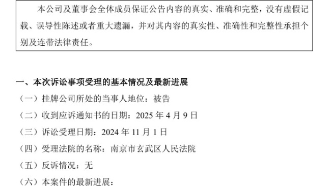 公司于2025年6月5日收到江蘇省南京市玄武區人民法院(2024)蘇 0102民初14767號《民事判決書》。
