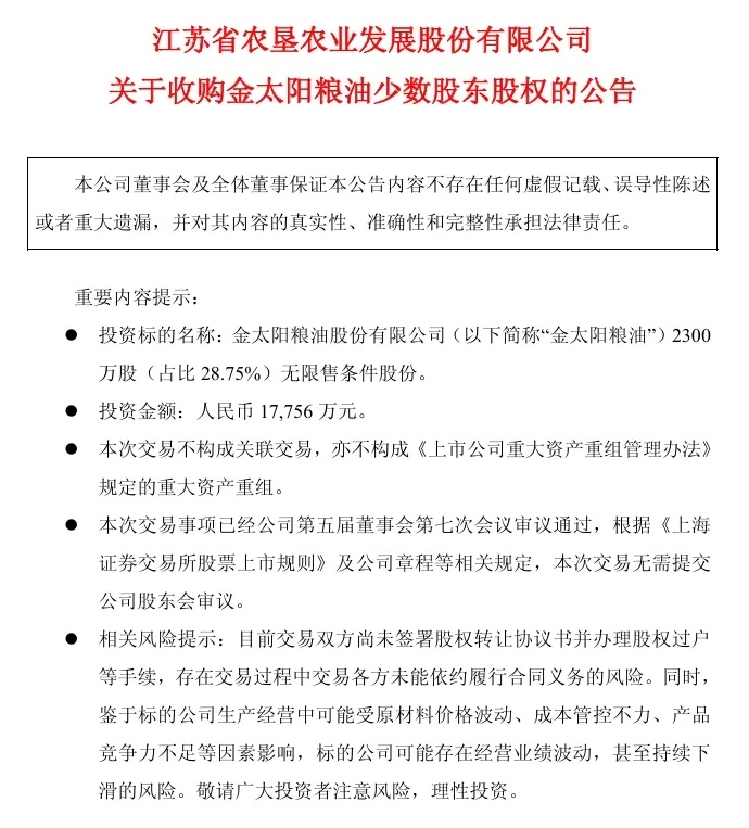 6月4日晚,蘇墾農發發布公告稱,擬收購金太陽糧油股份有限公司(以下簡稱太陽股份)少數股東持有的2300萬股股份,占太陽股份總股本的28.75%。此次投資金額為1.78億元,轉讓價格為每股7.72元。