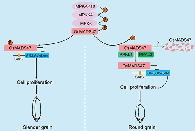 研究團隊通過對水稻34個調控穗發育的關鍵基因過表達,鑒定到一個調控水稻粒型的關鍵轉錄因子基因OsMADS47,該基因過表達后的水稻粒型呈細長粒,敲除后籽粒則呈短圓粒。研究表明,該轉錄因子可被水稻粒型發育調控蛋白激酶磷酸化修飾,導致其穩定性增強,進而抑制了粒長負調控基因GS3和粒寬正調節基因GW8的表達。同時,有關磷酸酶則通過去磷酸化拮抗這一過程。進一步研究發現,通過精準調控OsMADS47表達水平,可同步提升粒長與單株產量。該研究為水稻粒型改良提供了重要靶點,為水稻高產優質育種提供了新策略。