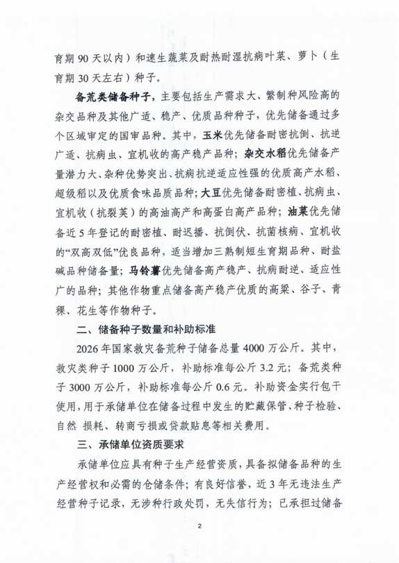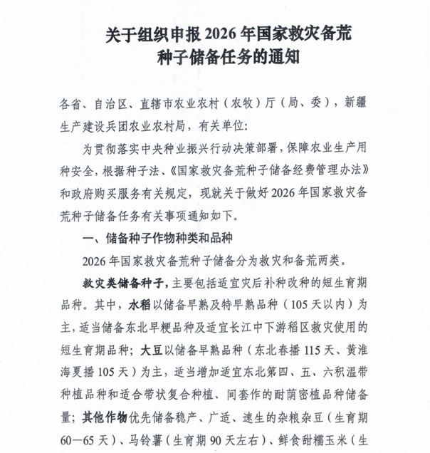 附件:農業農村部種業管理司關于組織申報2026年國家救災備荒種子儲備任務的通知