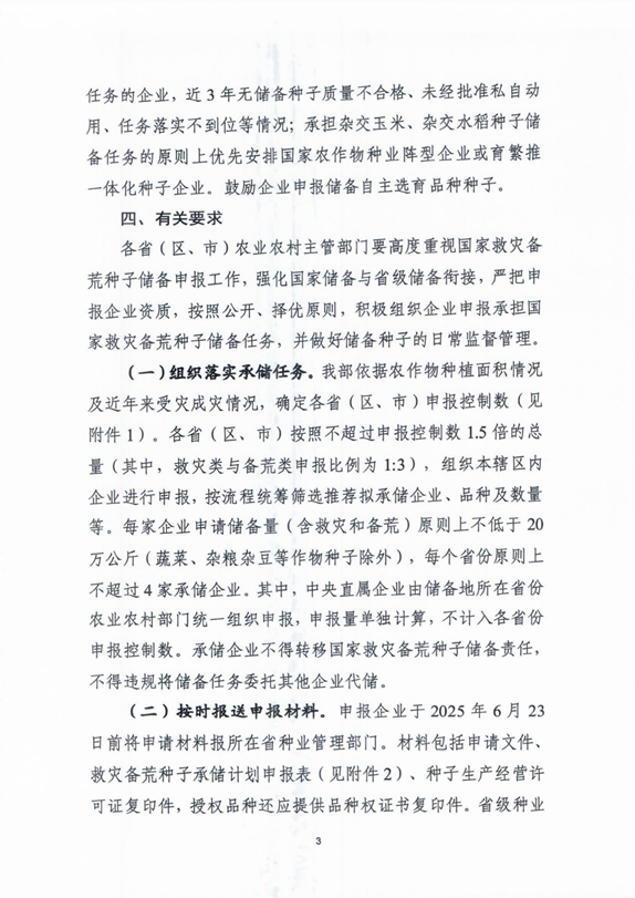現將農業農村部種業管理司《關于組織申報2026年國家救災備荒種子儲備任務的通知》(農種市函〔2025〕13號)轉發你們。請我省符合條件、有意愿申報的農作物種子企業積極申報,于6月23日前將申請材料報省種子站(以收到紙質申報材料為準),逾期不再受理。