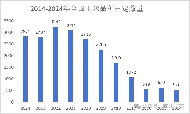 2014-2024年全國玉米品種審定總數為21413個。2017年以后,隨著聯合體、綠色通道試驗開展以來,全國玉米品種審定數量迅猛增長,2021-2022年達到最高峰,分別為3094和3244個,2023、2024年全國玉米品種審定總數穩定在2800個左右。