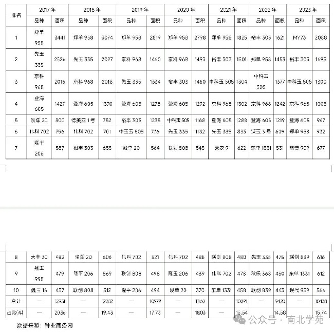 表2 2017-2023年全國玉米推廣前十品種推廣種植面積統計(單位:萬畝)