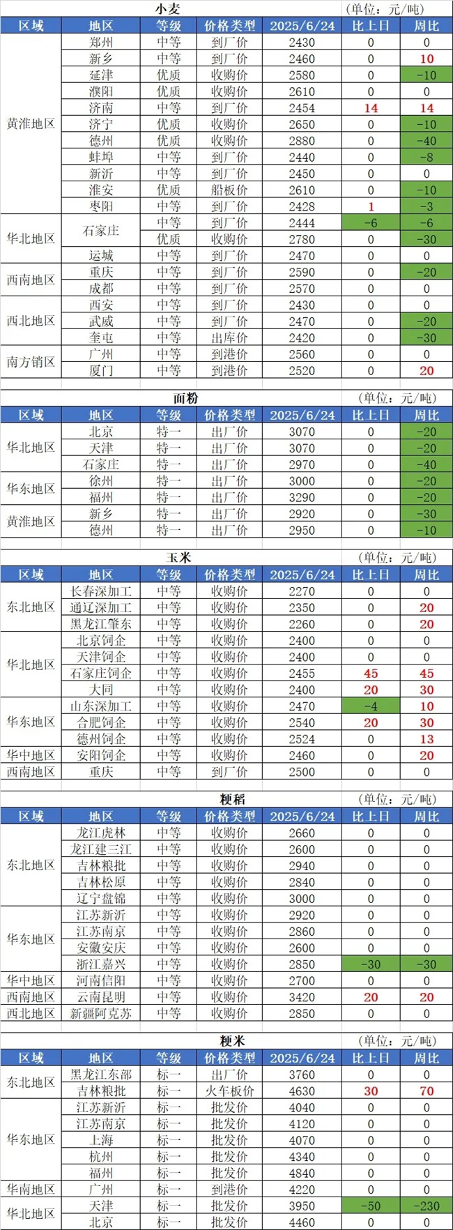 2、6月24日,國內部分玉米深加工企業玉米掛牌價調整:其中山東壽光天力藥業玉米收2480元/噸,較昨日下跌10元/噸;山東諸城興貿收2532元/噸,較昨日跌6元/噸;河南金玉峰收2580元/噸,較昨日跌10元/噸。