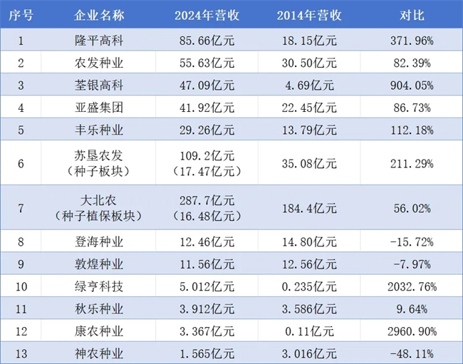 根據同花順、巨潮資訊網等公開資料,農財君整理了國內主要上市種業公司2014年-2024年的十年營收數據,呈現出一幅“冰火兩重天”的行業圖景。