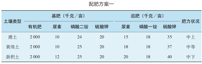 方案一:根據不同土壤類型,確定化肥以尿素、磷酸二銨、硫酸鉀為基肥,尿素、磷酸一銨、硝酸鉀為追肥的配肥方案,詳見下表。