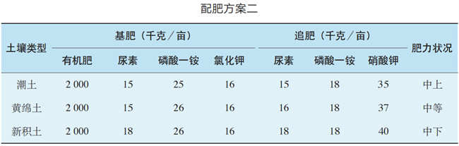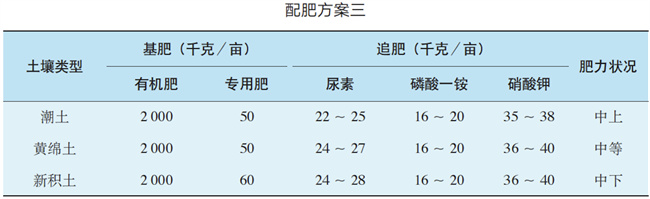 方案二:根據不同土壤類型,確定化肥以尿素、磷酸一銨、氯化鉀為基肥,尿素、磷酸一銨、硝酸鉀為追肥的配肥方案,詳見下表。