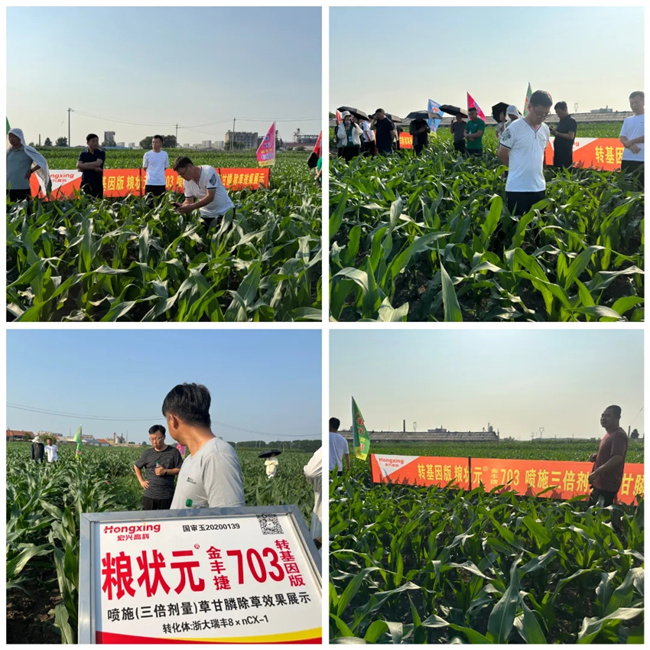 ▲觀摩糧狀元®金豐捷703展示田以及轉基因版糧狀元®金豐捷703在噴施三倍劑量草甘膦之后的除草效果展示