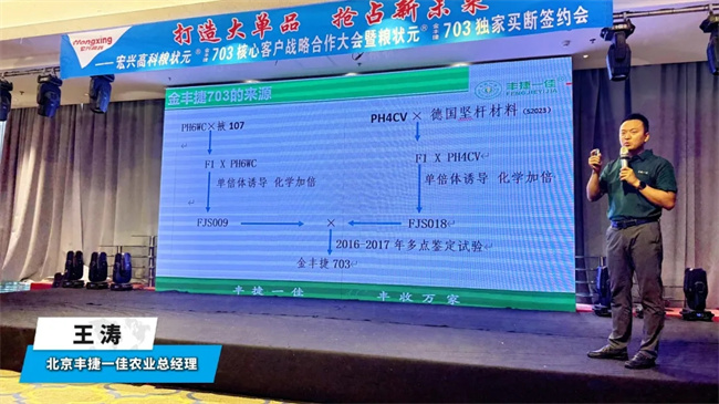 簽約儀式上,北京豐捷一佳王濤經理詳細介紹了糧狀元®金豐捷703品種選育背景、特征特性和應用前景及轉基因版進展,系統總結了糧狀元®金豐捷703試驗情況。