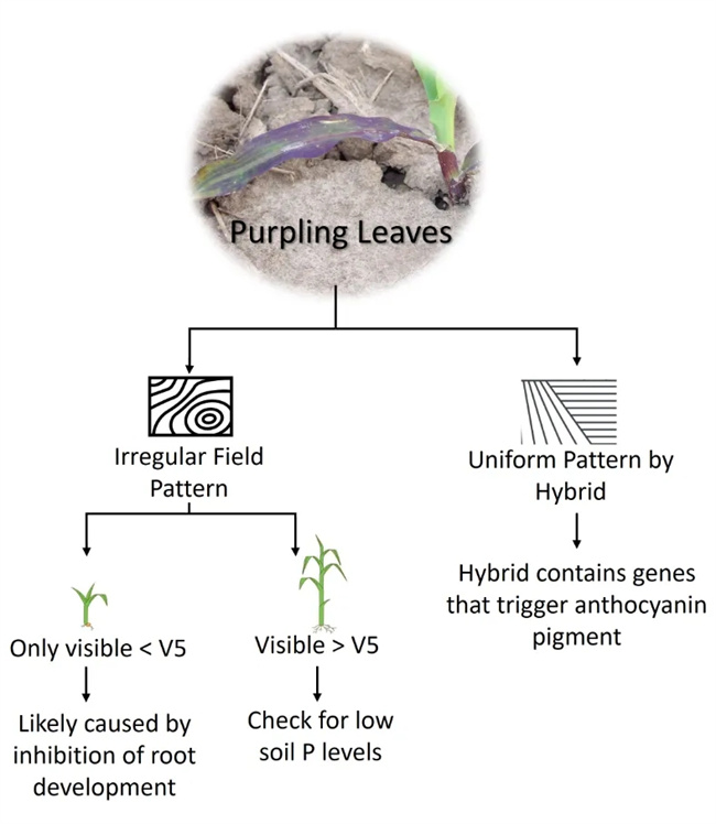 如果玉米在休耕期之后生長,一種名為菌根的根部真菌數量會減少。玉米的菌根感染有助于磷和鋅的吸收。在玉米根系分泌淀粉和糖分刺激菌根生長之前,紫色可能會持續存在。幸運的是,紫色持續時間很短,很少會在V6生長階段之后持續存在。這應該不會對田地的產量潛力產生影響。