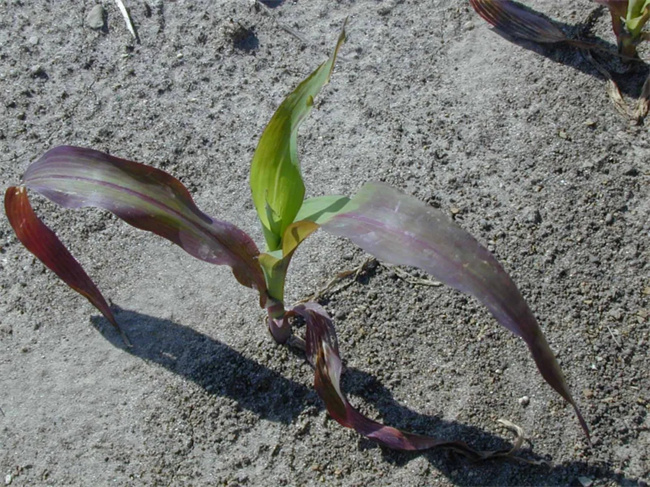 因化學除草劑損傷而根系生長受限,會因無法吸收磷而變紫。紫化持續時間以及隨之而來的產量潛力下降程度取決于損傷程度以及是否有利于根系再生的環境生長條件。