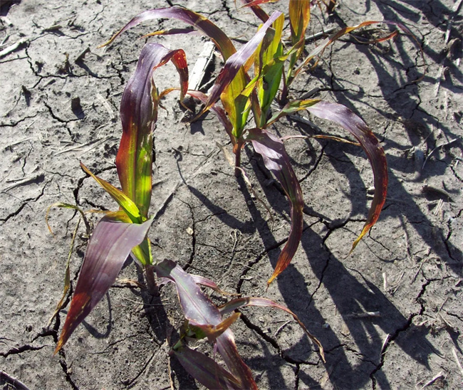 春季低溫加上土壤飽和,也會限制玉米幼苗根系生長和根系向土壤的滲透。這會限制養分吸收,從而阻礙玉米植株的緩慢生長。此外,由于陰涼潮濕的土壤中微生物活動減少,氮和硫等養分的礦化和植物可利用性也會減慢。同樣的條件也會導致玉米呈現紫色。土壤飽和導致根系生長受限,從而導致玉米葉片中糖分積累。這些糖分通常會用于根系生長,但當它們在葉片中積累時,會生成花青素,使葉片呈現紫色。
