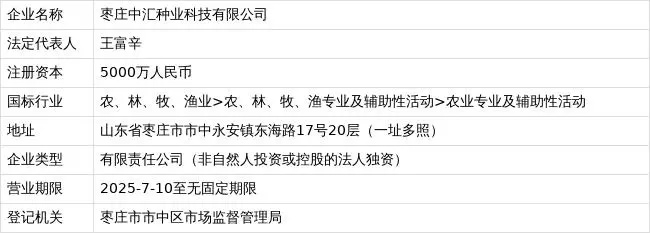 公開信息顯示,近日,棗莊中匯種業科技有限公司成立,法定代表人為王富辛,注冊資本5000萬人民幣,公司地址位于山東棗莊,由棗莊老城工業資產運營有限公司全資持股。