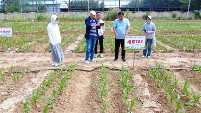 “福育703”是由河南億佳和農業科技有限公司培育的高產、耐密、多抗玉米新品種,于2024年通過審定。該品種株高穗位比例協調,莖稈彈性好,氣生根發達,抗倒能力強;耐密植,一般地塊可種植5000株/畝,高水肥地塊可達5500株/畝;耐高溫、陰雨寡照能力強,結實好,行數多,出籽率高達90%,百粒重高,高產潛力大。在大田表現中,綜合抗性強,尤其在2024年,抗穗腐病能力表現突出,深受市場歡迎。區試比對照增產7.6%,生產試驗比對照增產7.5%,增產效果顯著。