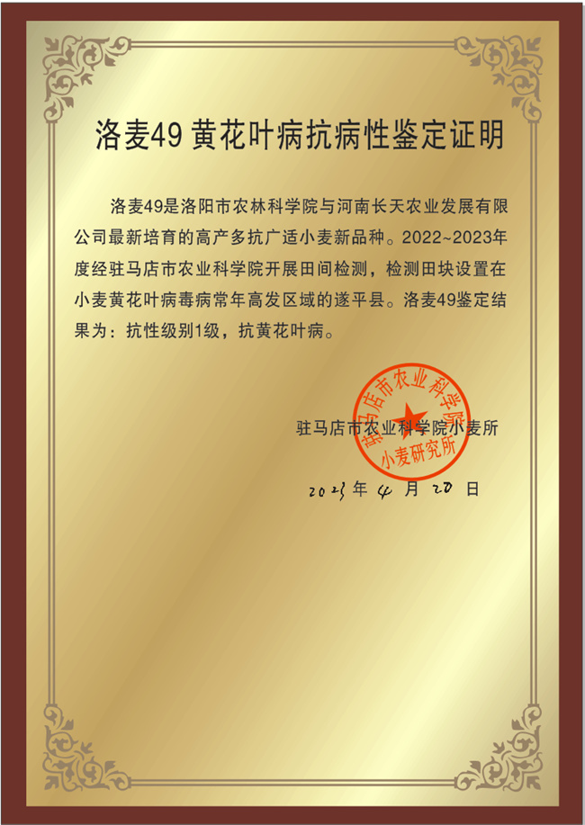 洛麥49后期耐熱性佳,落黃好,綜合抗病性強。2022-2023年度,在駐馬店市農業科學院位于小麥黃花葉病毒病高發區遂平縣的田間檢測中,抗性級別達1級,抗黃花葉病,為種植戶減少病害損失提供有力保障。