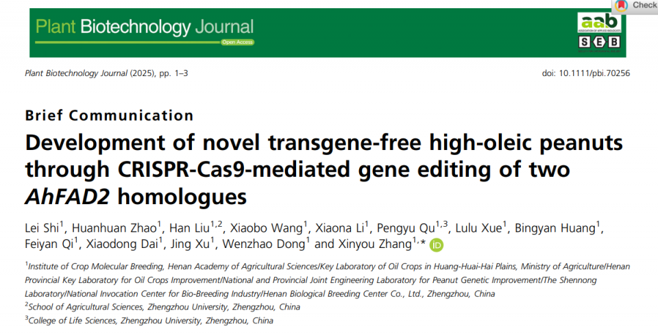 近日, 河南省農業科學院張新友院士團隊在國際知名學術期刊Plant Biotechnology Journal (IF 2024=10.5,中科院生物學一區,JCR5%)上發表了題為“Development of novel transgene-free high-oleic peanuts through CRISPR-Cas9 mediated gene editing of two AhFAD2 homologues”的研究論文,利用CRISPR/Cas9介導的基因編輯技術敲除花生AhFAD2基因,創制出不含外源基因的高油酸花生新種質,為花生新種質創制及對現有主栽品種精準改良提供了新途徑。