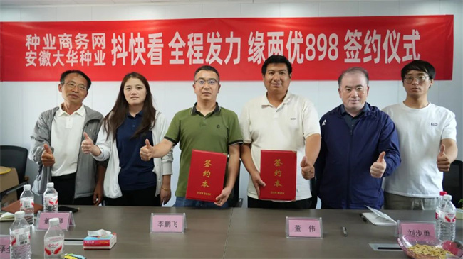 2025年7月21日,江蘇省大華種業集團有限公司安徽分公司經理李鵬飛一行蒞臨種業商務網直播基地進行考察交流,并與種業商務網“抖快看”簽訂了緣兩優898大單品流量增長合作協議。