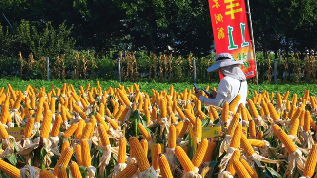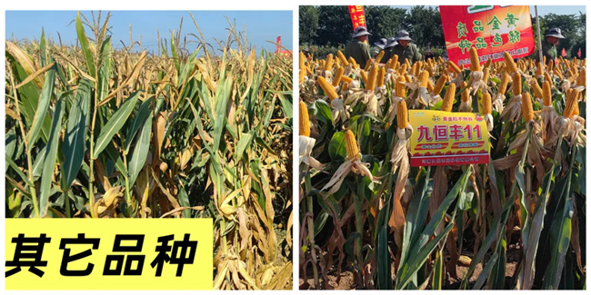 黃金粒不倒翁“九恒豐11”玉米品種是久恒農業采用熱帶資源與堅稈抗倒基因培育而成的高產、多抗型創新品種。在觀摩會現場,大田里金燦燦的果穗呈現出一派豐收景象,令觀摩嘉賓們贊嘆不已。在5000株/畝的種植密度下,九恒豐11棵棵有棒,棒棒均勻,穗子整齊,結實良好。尤其在2025年特殊的氣候條件下,這一品種的優異表現更是顯得難能可貴,贏得了觀摩嘉賓的高度贊譽。