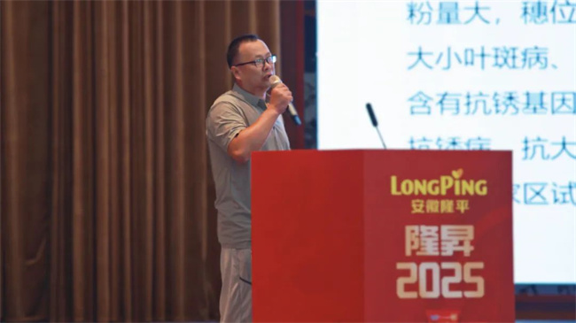 在大會上,黃淮海著名育種家、隆昇2025育種人劉俊恒作題為《黃淮海復雜氣候下隆昇2025品種競爭優勢》的主題演講。“隆昇2025,經過近十年選育而成,具備豐產性好、品質好、耐熱好、抗倒好、高抗青枯,抗銹病等優點,市場前景廣闊。”
