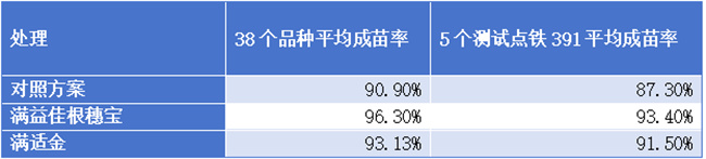 2025年基于38個品種的田測數據表明,滿益佳根穗寶方案成苗率平均達到96.3%,較對照方案出苗率高出5.4%。5個測試點鐵391平均成苗率比對照方案高出6.1%。