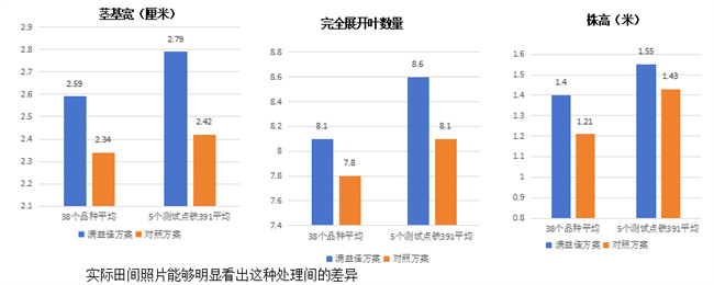 小喇叭口期進行莖基寬、完全展開葉數量和株高調查,每個品種每個處理取20株進行測量統計(中間4壟每壟連續取樣5株),最后計算平均值,結果表明滿益佳根穗寶方案各指標都高于對照,這表明滿益佳根穗寶方案在小喇叭口期依然能表現出明顯優勢。