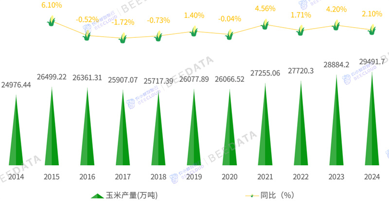 隨著玉(yu)米用種(zhong)面積的增(zeng)加(jia),中(zhong)國玉(yu)米產量(liang)(liang)也(ye)隨之增(zeng)長,據(ju)國家(jia)統計局數據(ju)顯示,2024 年(nian)(nian)中(zhong)國玉(yu)米產量(liang)(liang)創(chuang)歷史新高,達到 29491.7 萬噸(約合2.95億噸),同比(bi)增(zeng)長了(le)2.1%;與2014年(nian)(nian)的24976.44萬噸相比(bi),近10年(nian)(nian)間增(zeng)長了(le)4515.26萬噸,增(zeng)幅約為(wei)18.08%,年(nian)(nian)均復合增(zeng)長率約為(wei)1.68%。