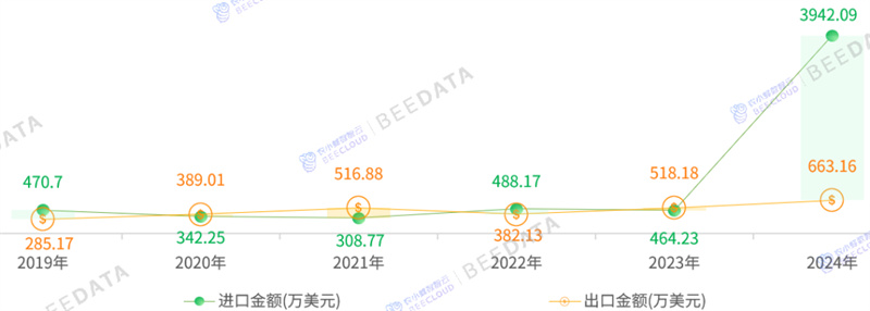 圖表14:2019~2024年中國種(zhong)用玉米進、出(chu)口金(jin)額變(bian)化趨勢對比(bi)