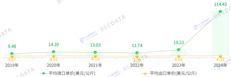 圖表(biao)15:2019~2024年(nian)中(zhong)國(guo)種(zhong)用玉(yu)米(mi)平(ping)均進(jin)、出口單價變化(hua)趨(qu)勢(shi)對比