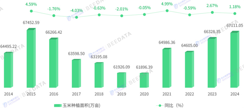 據(ju)國(guo)(guo)家(jia)統計(ji)局統計(ji)數據(ju)顯示,2024 年(nian)(nian),中國(guo)(guo)玉(yu)米用種面(mian)積(ji)達 67111.05 萬畝(mu)(約(yue)(yue)(yue)合6.71億畝(mu)),同比(bi)較 2023 年(nian)(nian)增加了(le) 782.7 萬畝(mu),增幅(fu)約(yue)(yue)(yue)為 1.18%;與 2014 年(nian)(nian)的64495.22 萬畝(mu)相(xiang)比(bi),近(jin) 10 年(nian)(nian)間(jian)增加 2615.83萬畝(mu),增幅(fu)約(yue)(yue)(yue)為4.06%,年(nian)(nian)均復合增長率約(yue)(yue)(yue)為 0.4%,我國(guo)(guo)玉(yu)米產業呈現持續穩定的發(fa)展態勢。