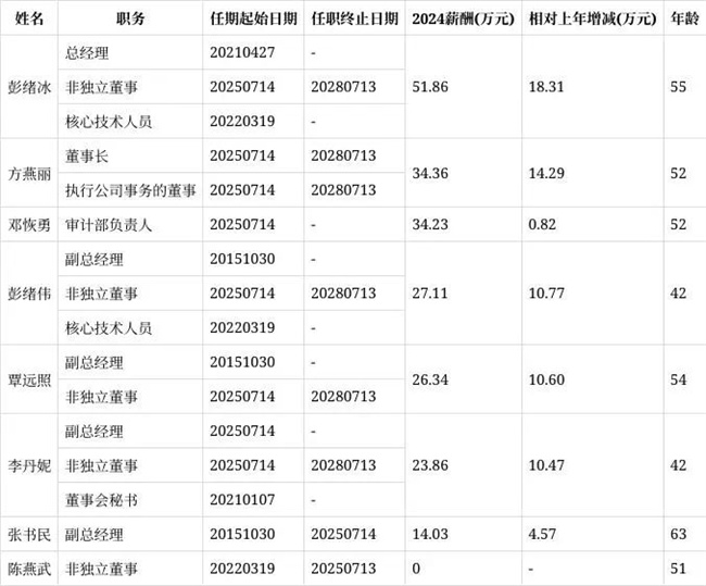 從薪酬看,董事和高級管理人員合計領取報酬211.79萬元,平均薪酬28.64萬元,年薪中位數為26.34萬元。其中,總經理、非獨立董事及核心技術人員彭緒冰薪酬最高為51.86萬元,副總經理張書民薪酬最低為14.03萬元(2024年任期不滿1年的不參與統計)。